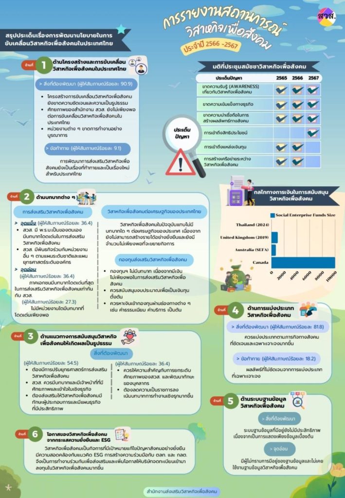 รายงานสถานการณ์วิสาหกิจเพื่อสังคมประเทศไทย พ.ศ. 2566-2567 ขอบคุณทุกความร่วมมือในการสะท้อนเพื่อการพัฒนาการทำงานของ สวส. โดยข้อเสนอดังกล่าวเป็นส่วนหนึ่งในรายงานเบื้องต้น “รายงานสถานการณ์วิสาหกิจเพื่อสังคมประเทศไทย พ.ศ. 2566-2567” ซึ่งเป็นการเก็บข้อมูลจากภาคีการดำเนินงานของ สวส. (วิสาหกิจเพื่อสังคม กลุ่มกิจการเพื่อสังคม), คณะกรรมการส่งเสริมวิสาหกิจเพื่อสังคม, พร้อมทั้งภาคียุทธศาสตร์ ในการขับเคลื่อนวิสาหกิจเพื่อสังคมในประเทศไทยต่อไป โดยรายงานฉบับสมบูรณ์อยู่ระหว่างการดำเนินการ และจะมีการนำเสนอต่อคณะกรรมการส่งเสริมวิสาหกิจเพื่อสังคมเพื่อรายงานต่อคณะรัฐมนตรีต่อไป โดยเป็นไปตามมาตรา 24 อนุมาตรา 7 แห่งพระราชบัญญัติส่งเสริมวิสาหกิจเพื่อสังคม พ.ศ 2562 หมายเหตุ : เป็นผลการวิจัยร่างที่ 1 ซึ่งเป็นการเก็บข้อมูลเชิงประจักษ์จากภาคีหุ้นส่วนยุทธศาสตร์ที่สำคัญต่อการขับเคลื่อนงานดำเนินการโดย วิทยาลัยนานาชาติ มหาวิทยาลัยมหิดล ซึ่งอยู่ระหว่างจัดทำรายงานฉบับสมบูรณ์